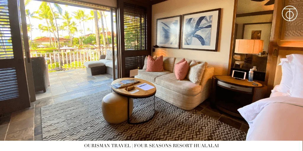 Along with its sister property on Maui, Four Seasons Hualalai is one of our top-selling hotels in the world. This is a spacious resort whose guest rooms and suites are arranged in four oceanside crescents and a fifth group of rooms alongside the 18th green of the resort’s golf course… five resorts within the resort. We recommend the Palm Grove Crescent for honeymooners and romantic getaways, more secluded with its own adults-only Tranquility Pool. We loved our room on the second floor overlooking Palm Grove. Ground floors feature outdoor showers, however, the second floor has more serene views and an additional level of privacy.