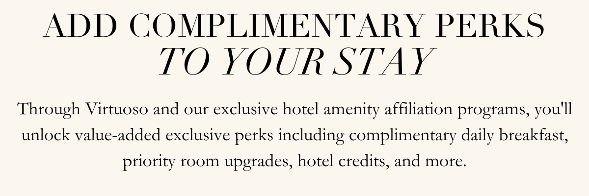 For 2024, Virtuoso amenities include an upgrade on arrival (subject to availability), a daily buffet breakfast for two guests, and a $100 food and beverage credit. Suite bookings receive an additional $100 credit, totaling $200 during the stay. Contact us to learn more.
